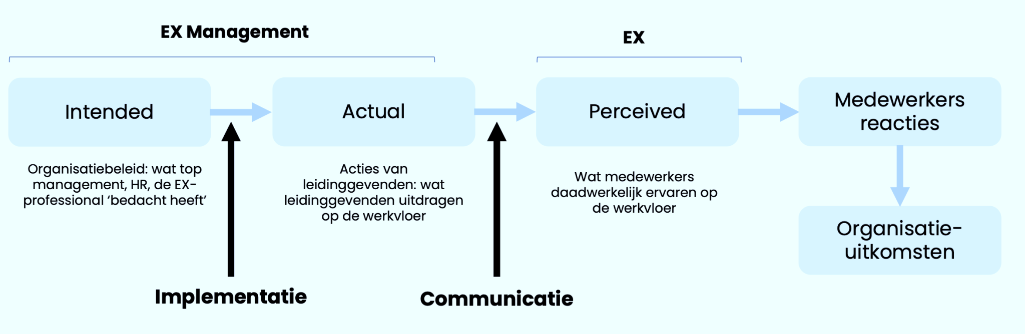 Waar HR en management strategieën bedenken (Intended), vertalen leidinggevenden dit op hun eigen manier naar de werkvloer (Actual). Uiteindelijk bepaalt de perceptie van medewerkers (Perceived) of het beleid ook écht wordt gevoeld.